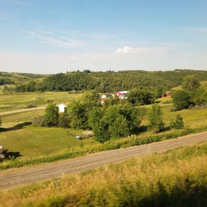 Because we didn’t board until almost 11:00 PM, I slept through most of Minnesota (St. Cloud, Staples, Detroit Lakes) and woke somewhere between Fargo, North Dakota and Grand Forks, ND. The sun was rising as we headed into Devil’s Lake, ND. All you can see is miles and miles of farmland, corn, wheat, soy and probably many other crops, silos, and, here and there, a farmhouse. Many ponds, occasionally cows or horses, and every once in a while, a town. The land is pretty flat until we reached Minot, ND (pronounced MY-knot). We were able to get off the train and wander for almost an hour.