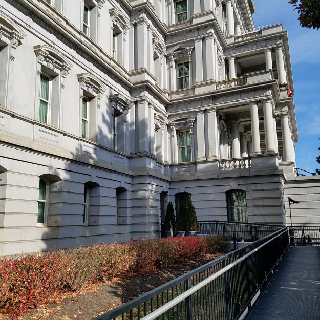 After a lunch break, at about 1:00 PM, we went the few short blocks from the Willard to the White House. As we were standing in line, a slovenly man on a bicycle started screaming at us through a megaphone his distaste for our President. We far outnumbered him so our chants of “USA”, “Trump”, or “Four More Years” made him slink off to accost another target. Made for an amusing interlude…