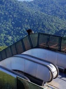 We left the hotel at 7:20 AM to visit the Christ the Redeemer statue. This is a very popular attraction here in Rio de Janeiro and being on the first tram means the crowd is much smaller than later in the day. Unfortunately, the escalator was not working so we had to climb the 220 steps up to the monument. There is an alternative route to the tram—a two mile hike up the mountain which, had I not been with a tour, I may have considered. As you can see, the view of the harbor from the mountain top in breathtaking. The monument itself is magnificent, 98 feet high, excluding its 26 foot pedestal. The arms stretch 92 feet wide and it is covered with six million stone tiles. We were told that most of the tiles have messages written on the backside by the workers who installed them. While up there, I saw several monkeys cavorting on the railings but, unfortunately, they were somewhat camera shy and refused to sit still for me.